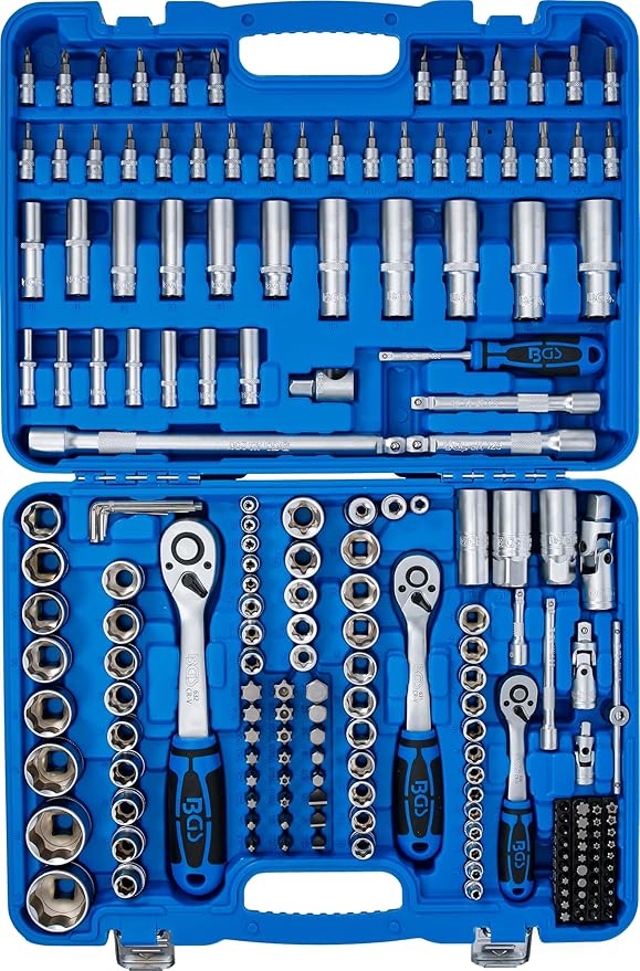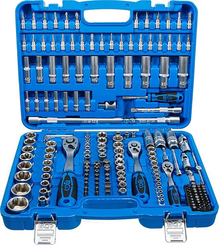 Detta omfattande verktygsset är tillverkat av slitstarkt krom-vanadiumstål och innehåller hylsor med Super Lock-/korrugerad profil i storlekarna 6,3 mm (1/4"), 10 mm (3/8") och 12,5 mm (1/2"). Setet inkluderar ett fintandat omställbart spärrhandtag med 72 kuggar för exakt arbete. Leveransinnehållet består av 7 vinkelnycklar för inre sexkant i storlekarna 1, 1,5, 2, 2,5, 3, 4 och 5 mm samt ett brett urval av verktyg för 1/4"-fäste: omställbart spärrhandtag, glidhandtag, förlängningar på 50 mm och 100 mm, kardanled, vridhandtag på 150 mm, 13 standardhylsor i storlekar 4 till 14 mm, 7 djupa hylsor från 4 till 10 mm, 5 E-profilhylsor (E4–E8), bitshållare för 6,3 mm bits, 6 bitshylsor för krysspår (PH0–PH2, PZ0–PZ2), 4 bitshylsor för spår (4–7 mm), 4 insex-bitshylsor (3–6 mm), 8 Torx-bitshylsor (T8–T30) och 8 Torx-bitshylsor med borrning (T8–T30). För 3/8"-fäste ingår spärrhandtag, 125 mm förlängning, kardanled, tändstiftsnyckel 18 mm, 10 standardhylsor (10–19 mm), 6 djupa hylsor (10–15 mm), 6 E-profilhylsor (E10–E18) samt bitshållare för 8 mm bits. För 1/2"-fäste medföljer spärrhandtag, förlängningar på 125 mm och 250 mm, glidhandtag-adapter, bitshållare för 8 mm bits, kardanled, två tändstiftsnycklar (16 mm och 21 mm), 17 standardhylsor från 10 till 32 mm, 5 djupa hylsor (16–22 mm) och 2 E-profilhylsor (E20, E24). Setet innehåller även bits med 8 mm fäste: 3 spår (8–12 mm), 4 krysspår (PH3, PH4, PZ3, PZ4), 5 insex (7–14 mm), 6 Torx (T40–T70) och 6 Torx med borrning (T40–T70). För 1/4"-fäste medföljer 10 Torx (T5–T40), 8 Torx med borrning (T7–T40), 5 RIBE (M5–M9), 3 mångtand (M5–M8), 8 TS-profil (TS10–TS45), 4 krysspår (PH3, PH4, PZ3, PZ4) och 2 insex (2, 2,5 mm). Denna verktygssats är ett professionellt och mångsidigt val för både fordonsmekaniker och avancerade gör-det-självare.