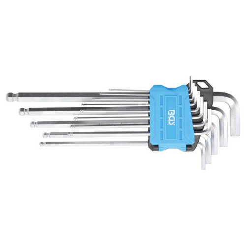 Detta set med insexnycklar i tumsstorlekar är utformat för professionell användning och levereras i en praktisk, fällbar hållare för enkel förvaring och transport. Samtliga nycklar är tillverkade med kulända på långsidan, vilket möjliggör arbete i vinklade positioner och ökar flexibiliteten i trånga utrymmen. Setet innehåller totalt 13 stycken insexnycklar i följande storlekar och längder: 0.05" (16 mm kort sida, 80 mm lång sida), 1/16" (17 mm, 90 mm), 5/64" (18 mm, 100 mm), 3/32" (20 mm, 112 mm), 7/64" (22 mm, 115 mm), 1/8" (23 mm, 126 mm), 9/64" (25 mm, 132 mm), 5/32" (26 mm, 140 mm), 3/16" (29 mm, 163 mm), 7/32" (34 mm, 167 mm), 1/4" (37 mm, 182 mm), 5/16" (41 mm, 205 mm) och 3/8" (45 mm, 230 mm). Den robusta konstruktionen och den exakta passformen gör detta set idealiskt för underhåll, reparation och montering inom både industri, verkstad och hemmaprojekt.