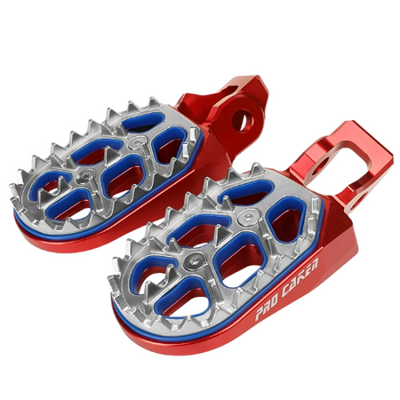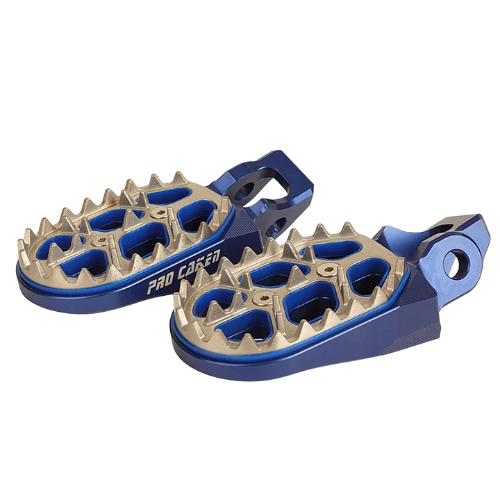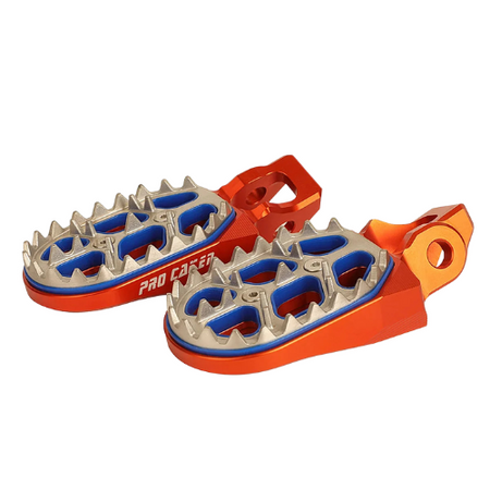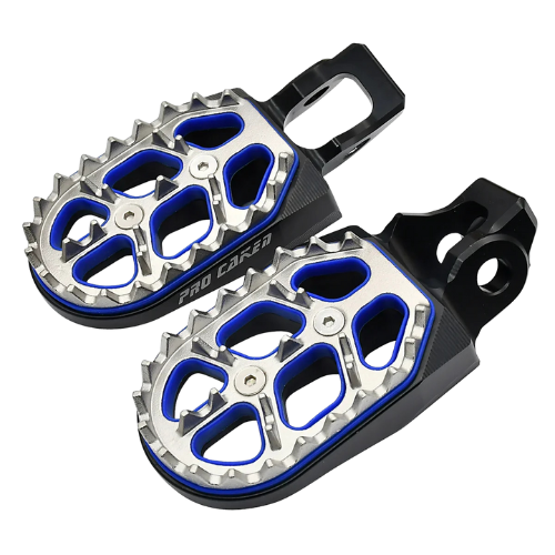 Fotpinnar för Husqvarna TC, FC, TE, FE, TX, FX och FS modeller i motorstorlekarna 85, 125, 150, 200, 250, 300, 350, 450 och 501 är konstruerade för att passa årsmodeller från 2016 till 2023 och erbjuder ett stabilt, greppsäkert och hållbart stöd för förarens fötter vid både motocross- och endurokörning. Dessa fotstöd är tillverkade i högkvalitativt smitt eller CNC-fräst material, vanligtvis rostfritt stål eller hårdanodiserad aluminium, vilket ger maximal motståndskraft mot slitage, rost och deformation vid hårda landningar eller stötar i krävande terräng. Designen är bredare än på standardfotpinnar vilket ger ökad stabilitet och komfort under längre körpass samtidigt som aggressiva tandade ytor ger bättre grepp och minskar risken för att foten glider även i lera eller regn. Monteringen sker direkt i originalinfästningarna utan behov av modifieringar vilket gör dem enkla att installera för både nybörjare och erfarna förare. Dessa fotpinnar är ett populärt val för förare som söker ökad kontroll, bättre ergonomi och förbättrad körkänsla oavsett om det gäller tävlingsbruk, träning eller tuff terrängkörning. De är även ett estetiskt tilltalande tillbehör som kan bidra till att ge din Husqvarna en mer personlig och aggressiv look.