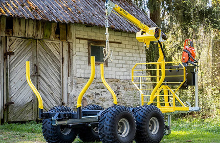 För tunga lyft finns en timmerkran som ansluts till ATV:ns 12V-batteri och klarar upp till 300 kg i lyftkapacitet. Kranen är ovärderlig vid timmerkörning, pallhantering och för att kontrollera lossning eller tippning av lasten, vilket gör arbetet enklare och säkrare.
